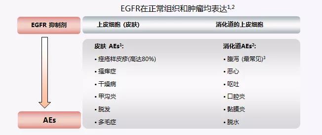 EGFR抑制劑作用于皮膚上皮細胞時,可能會引起痤瘡樣皮疹、搔癢癥、干燥病、甲溝炎、脫發、多毛癥等;EGFR抑制劑作用于消化道的上皮細胞時,可能會引起腹瀉、惡心、嘔吐、口腔炎、黏膜炎、脫水等。
