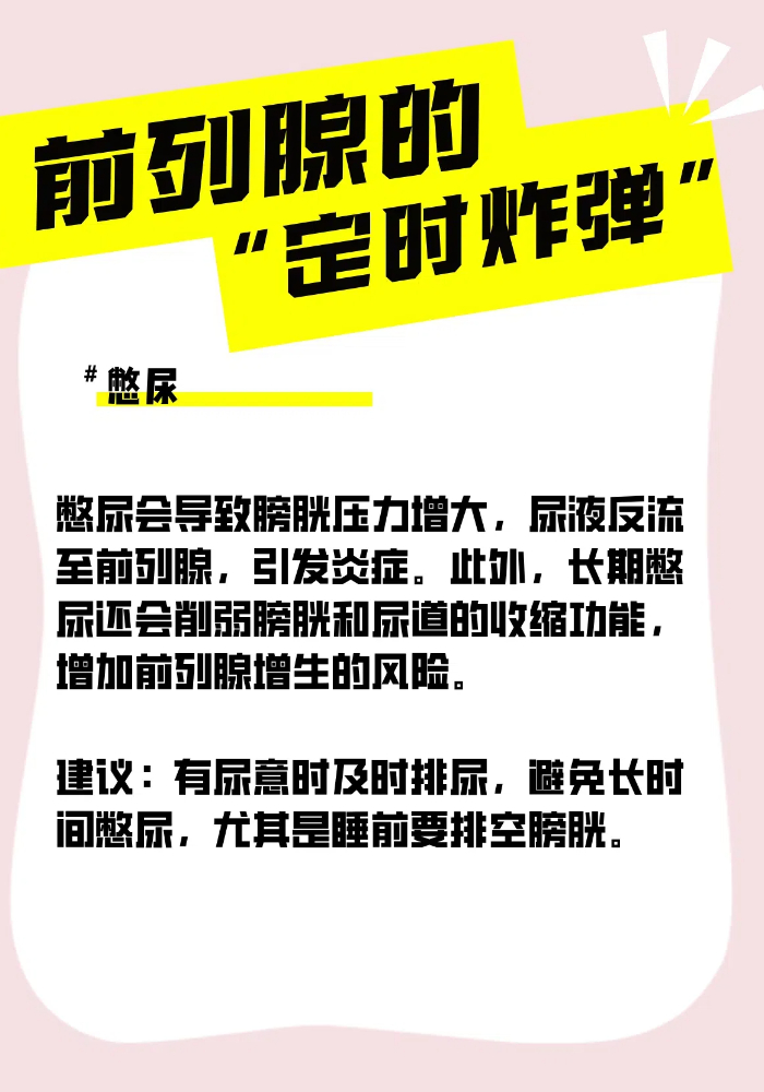 前列腺是男性的“生命腺”,但它也很脆弱。久坐不動、酗酒熬夜、憋尿等行為,都會讓前列腺“不堪重負”,甚至引發嚴重的健康問題。男性朋友們一定要重視前列腺健康,改掉不良習慣,做到早預防、早發現、早治療。